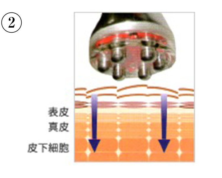 高周波を生体組織に流した場合には、高周波の特徴と生体組織の電力抵抗によってエネルギーの流れやすい部分が決まりそこで発熱します。また、皮膚の奥までマッサージ致します。
